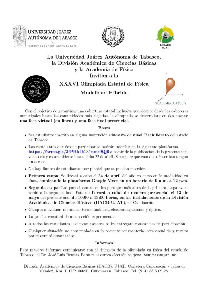 ¡Ya puedes inscribirte a la XXXVI Olimpiada Estatal de Física! Si eres estudiante de bachillerato (o secundaria ) y quieres participar, regístrate aquí: https://forms.gle/3fPHk4k131nmr9Qj6. ¡Te esperamos!